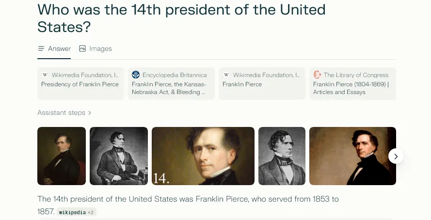 Perplexity AI is a fine LLM for solving simple queries, like "Who was the 14th President of the United States?". It delivers an up-to-date answer, accompanied by relevant web sources, which is great for quick fact-checking. Yet, Perplexity AI's prioritization of web search results weakens its generative resources. In short, Perplexity is great for quick Q&A tasks, but inferior to ChatGPT for projects that involve creativity.