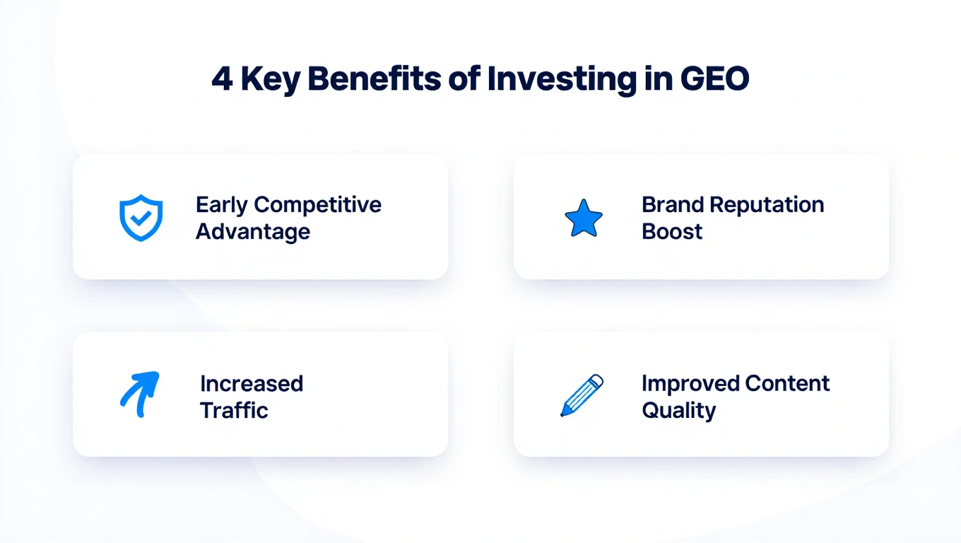 GEO is only getting started, but that doesn't mean you should leave it to the future. Adopting a clear GEO strategy right now can be especially beneficial for your brand and business, and here's why: